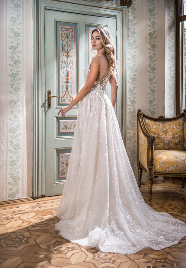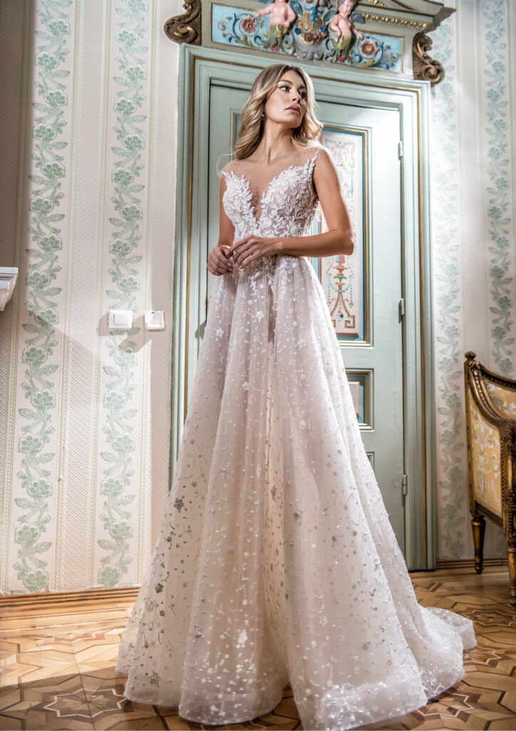 Rochie mireasa stil A line din tulle cu aplicatii de broderie si mici accesori atasate din loc in loc pe toata lungimea rochiei. Decolteul  este in  V  cu spatele frumos transaprent  si cu nasturi.