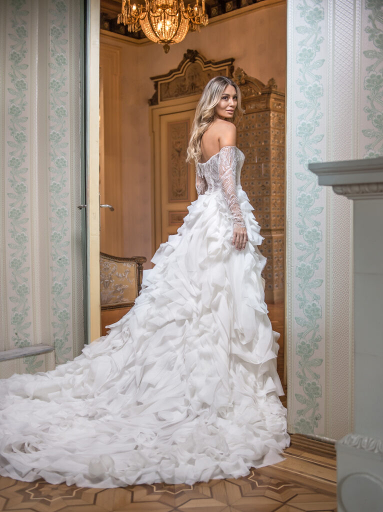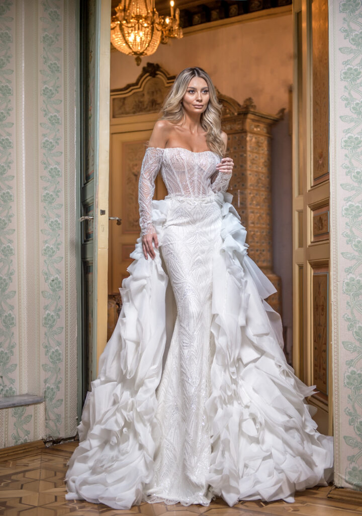 Rochie de mireasa stil sirena cu umerii goi si maneci lungi,aceasta rochie este din tul plin cu mărgele delicate care străluceșc ori de câte ori prinde lumina. O trena detasabila din volane verticale completează aspectul.