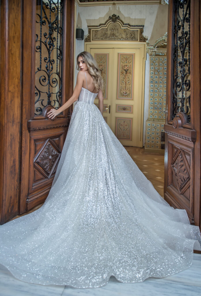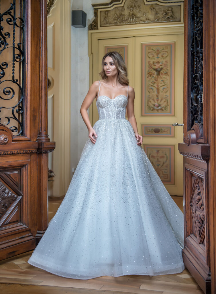 Vera Sposa » Rochii de mireasă » Colecția Couture » PEARLPEARLROCHII DE MIREASăRochie de mireasa stil printesa din tulle cu glitter,corset in forma de inima foarte cambrat cu bretele subtiri,avand o usoara trena. COD PRODUS VS-0351-10848 » PROGRAMEAZA O VIZITA