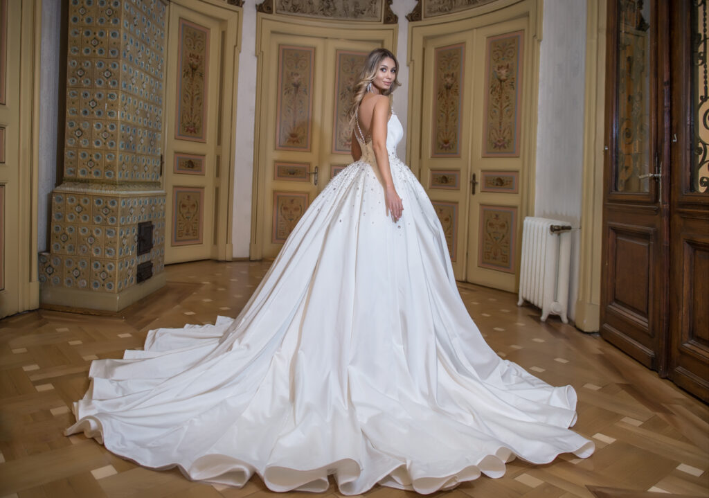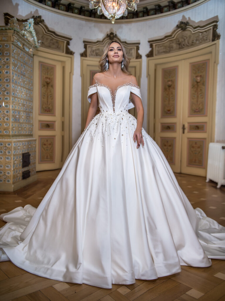 Rochie de mireasa stil printesa regala cu bretelute detasabile,avand  sustinre pe umeri din tulle,corsetul adanc in V cu aplicatii de pietricele  swarovski.Trena este una impunatoare.