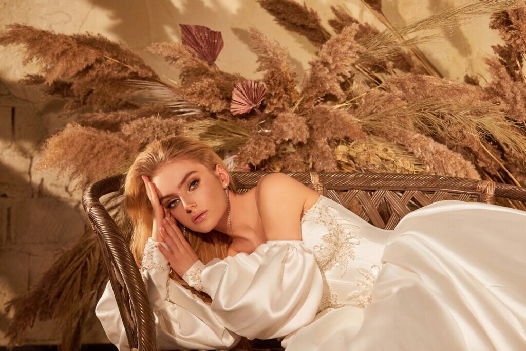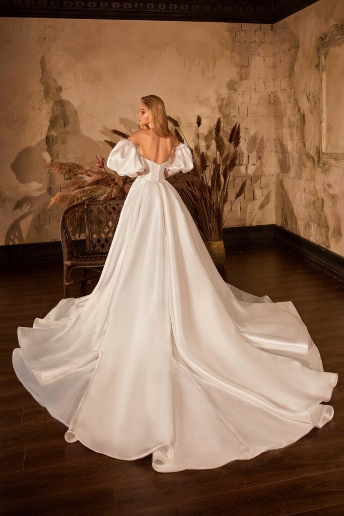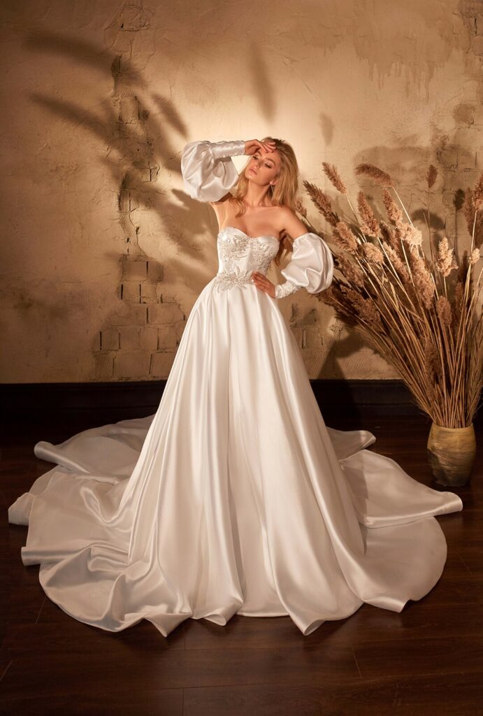 Rochie de mireasa printesa cu aer regal din mikado, cu corset in forma de inima si aplicatii atent alese si aplicate delicat pe corset . Manecile bufante detasabile cu aplicatii la terminatia manecii impreuna cu trena ampla dau un aer regal rochiei
