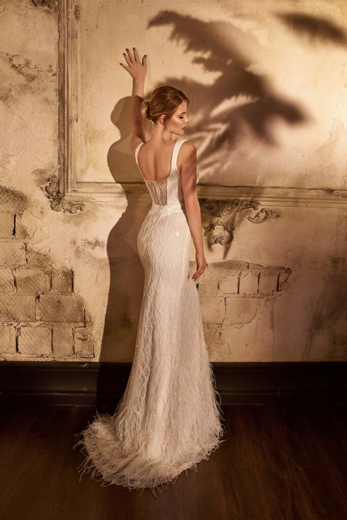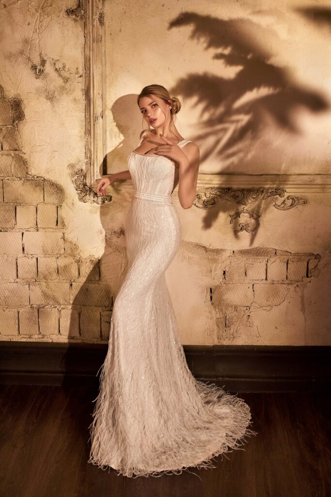Îmbrăcată la perfecțiune, această rochie cu mărgele din cap până în picioare are un decolteu pe drept, bretele subțiri și un detaliu in talie ce accentueaza foarte bine silueta,  spatele are un detaliu decupat  ce prin transparenta lasa sa se vada si mai mult spatele gol ,care se îndreaptă către un trena strălucitoare  din tull cu margele.