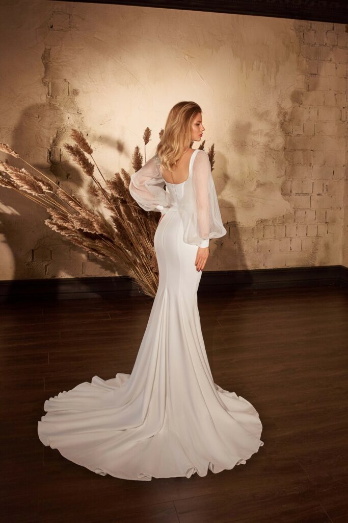 Rochia de mireasa se evidentieaza prin simplitatea si senzualitatea materialului. Modelul este potrivita pentru miresele care doresc sa fie in ziua nuntii simple, dar si elegante. Aceasta rochie este usor de purtat, materialul imina fiind elastic si se muleaza foarte bine pe silueta. Manecile lungi ii confera rochiei o nota de eleganta.