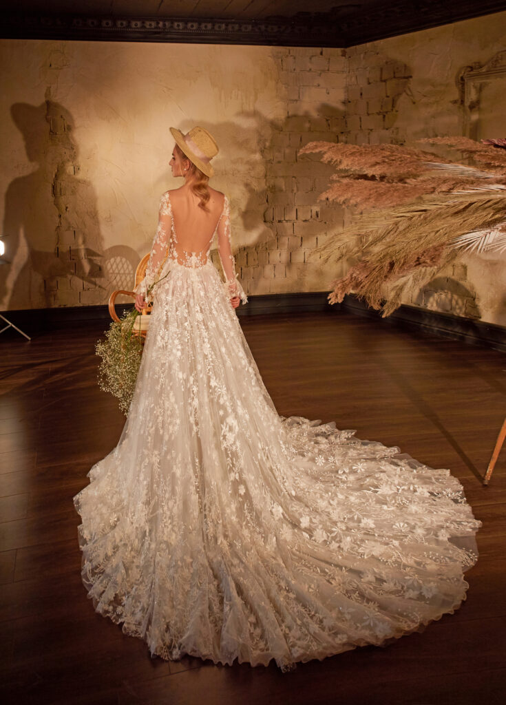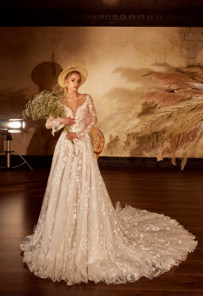 Rochie de mireasă romantică A line cu mâneci lungi și decolteu în formă de V. Un model vaporos cu spate gol, trenă și aplicații florale 3D .