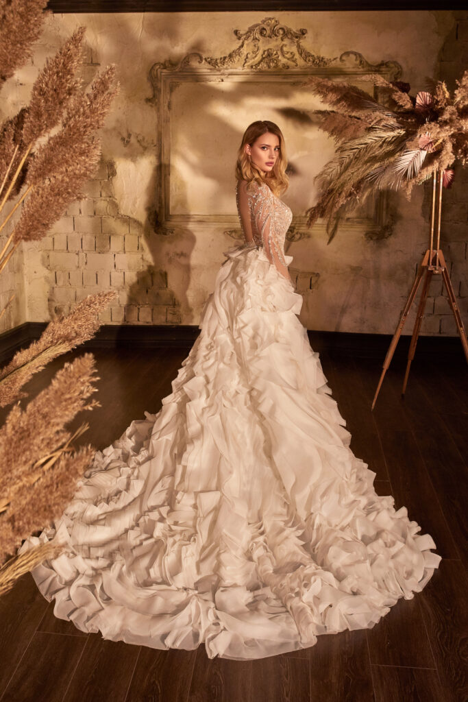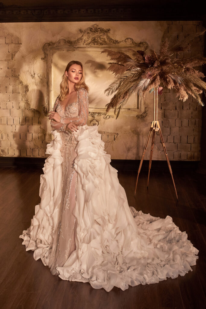 Dantela și mărgelele magnifice împodobesc această rochie senzuală cu un decolteu în forma de inima si corset transparent , iluzie de spate gol din tull nuanta pielii, inchis cu nasturi . Poate fi accesorizata opțional cu trena din imagine .
