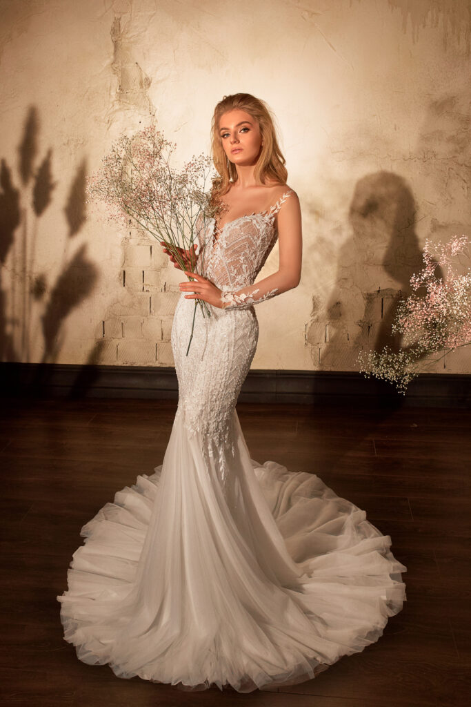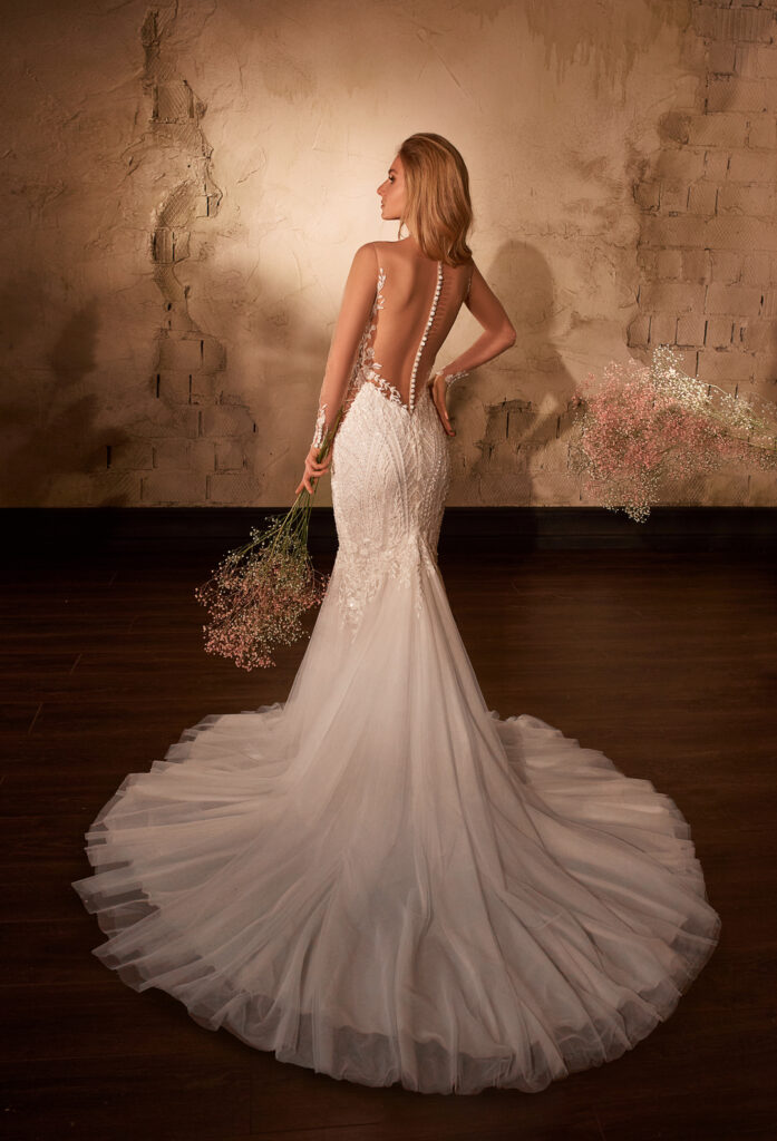 R ochie de mireasa stil sirena .Alcătuita din tul de mătase alb lăptos, împodobit cu dantela brodata delicat. Rochia este susținută de un corset Sheer cu un model interior în v. Aceas model are maneci lungi si spatele ce da impresia ca este gol ,din tul transparent si inchis cu nasturi .