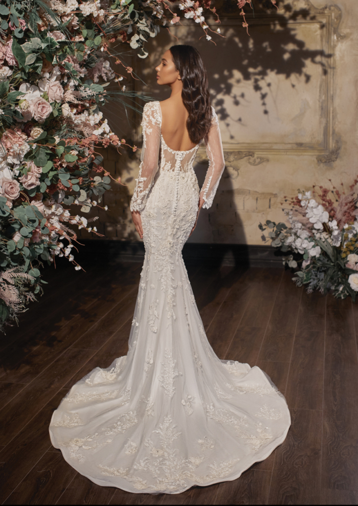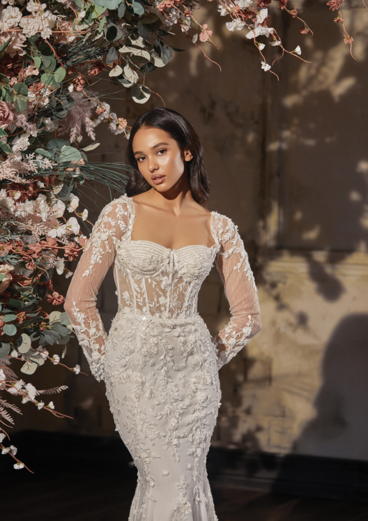 Rochie de mireasa tip sireana, eleganta, corset transparent cu dantela fina brodata cu margele si maneci ce intregesc rochita.