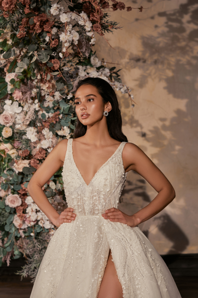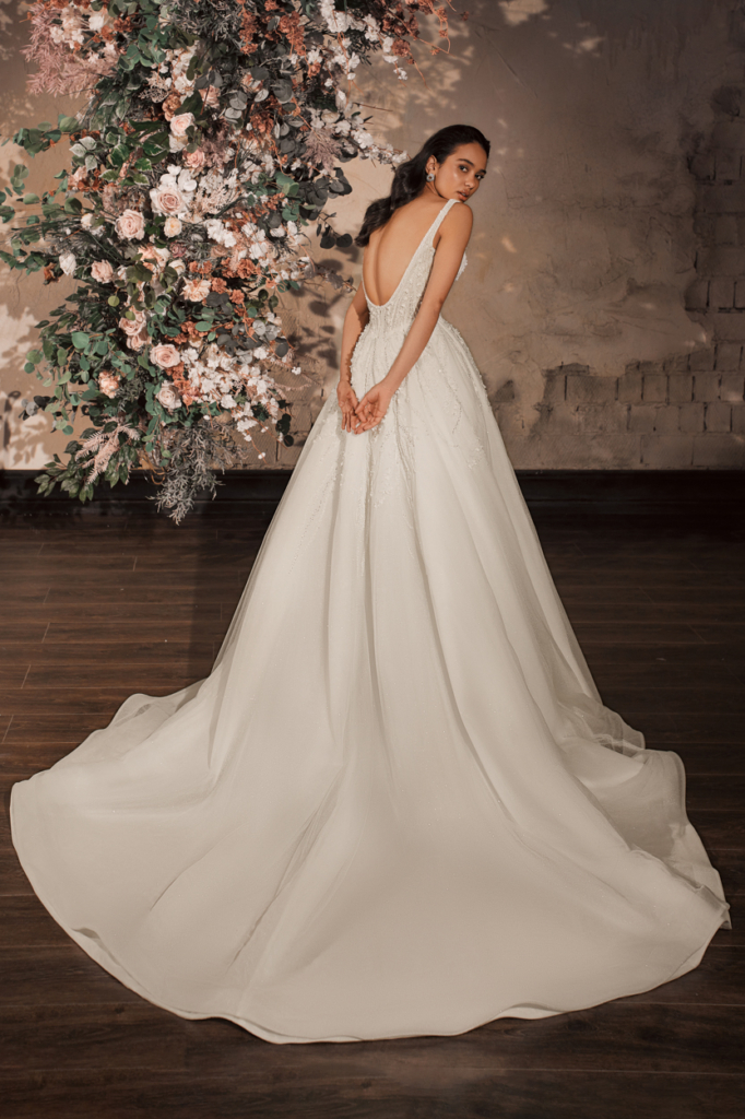 Rochie de mireasa tip linia A, cu ocrapatura pe picior. O rochie romantica si atragatoare. Cu bretele si decolteu in forma V, aceasta rochie este o bijuterie in partea de sus a corsetului prin aplicatiile de dantela cu margele pretioase .