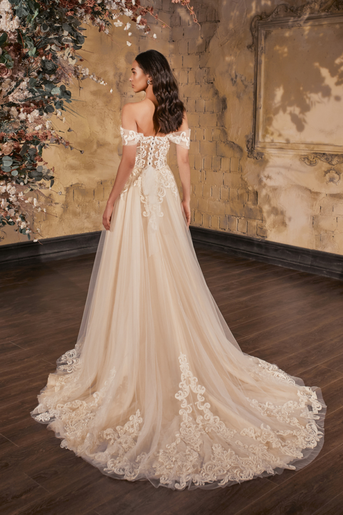 Rochie de mireasa tip linie A, cu umeri goi si maneci lungi, corset transparent acoperit de dantela brodata coborand usor pe fusta .
