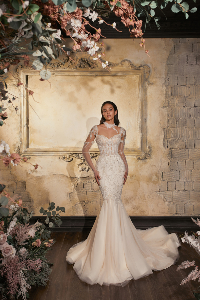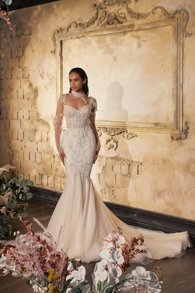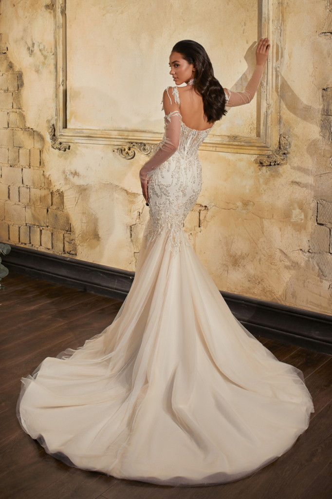 Rochie tip sirena eleganta, din tulle cu broderie arginata cu maneci fine detasabile. Rochita este completata de accesoriul de la gat.