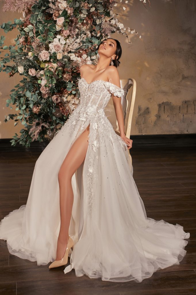 Rochie de tip linie A, vaporoasa, corset transparent bine definit cu aplicatii argintate si flori 3D ce evidentiaza talia.