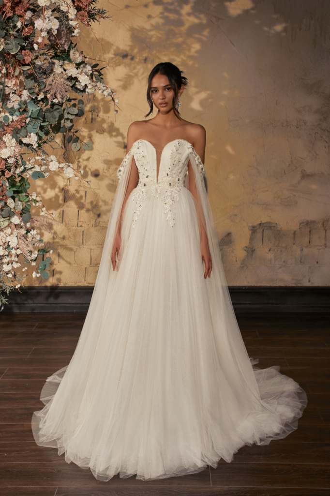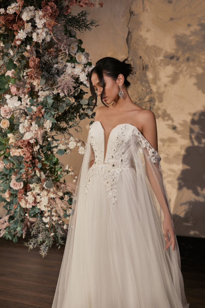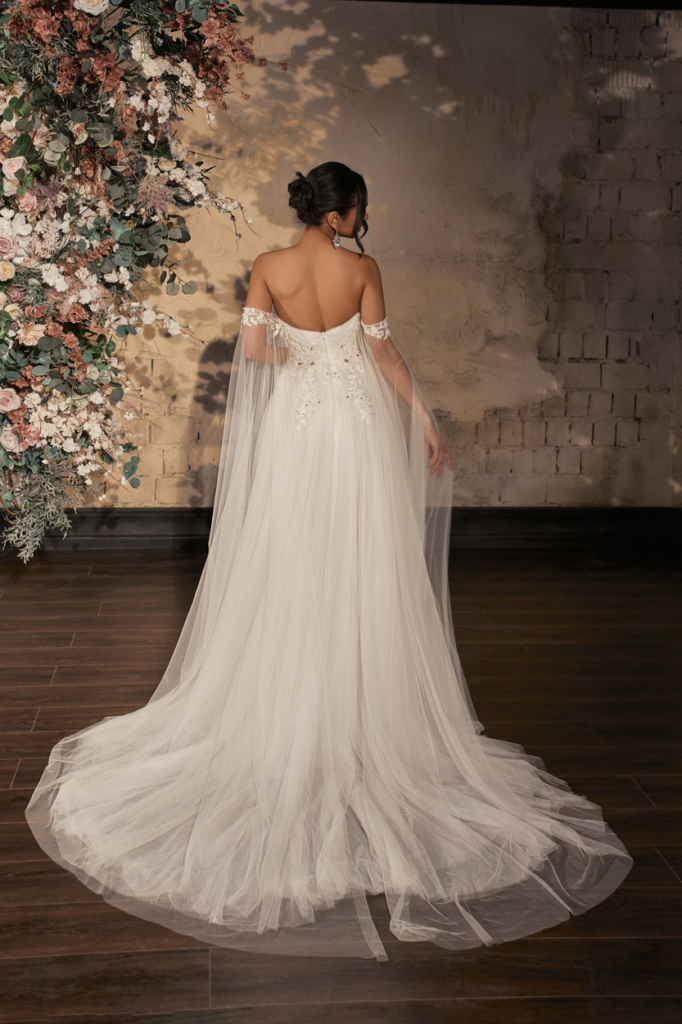 Rochie de mireasa tip  linie A, senzuala si romantica, corset cu decolteu adanc, bretele brodate cazute pe brate, continuate cu tulle ce se pierd in fusta rochiei.