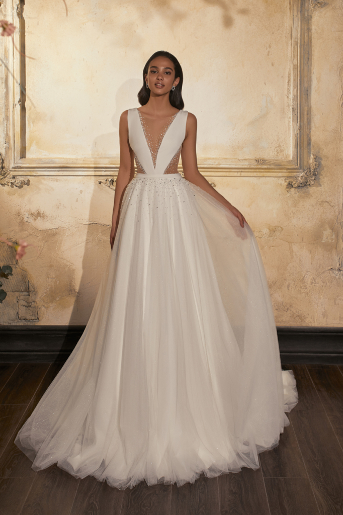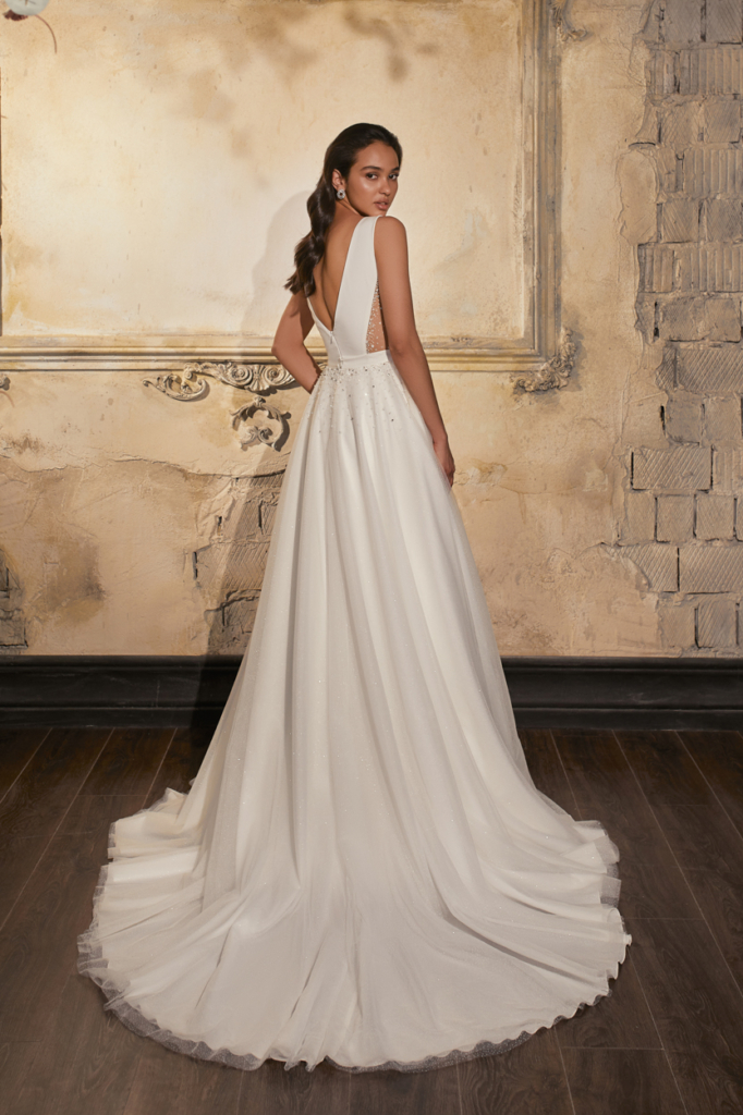 Rochie de tip linie A din material textil. corset cu decolteu adanc si spatele in V. Decolteul, lateralele si crapatura fustei din tulle bej sunt evidentiate de margele si pietre. Rochita are o trena detasabila din tulle cu sclipici si aplicatii.