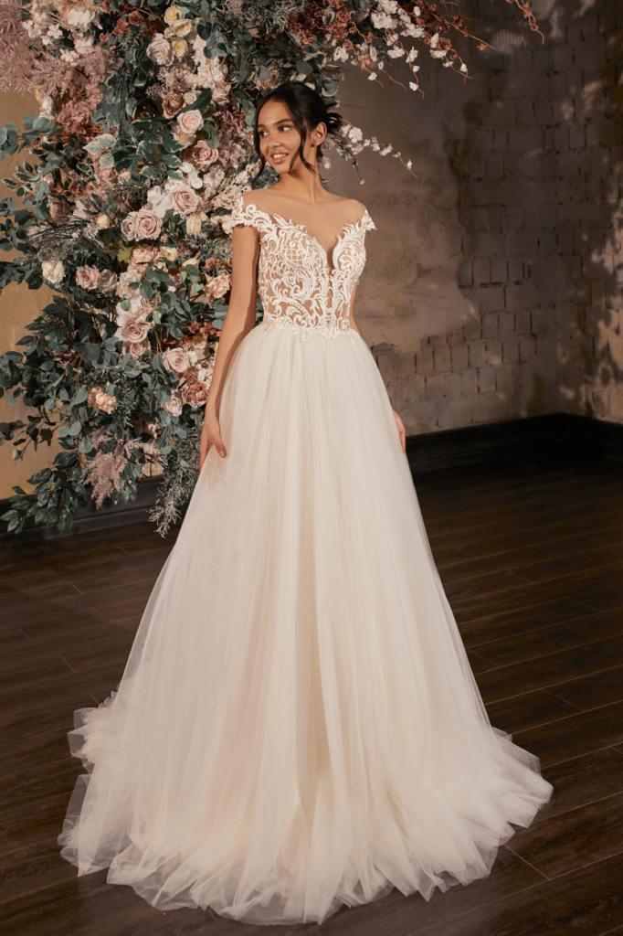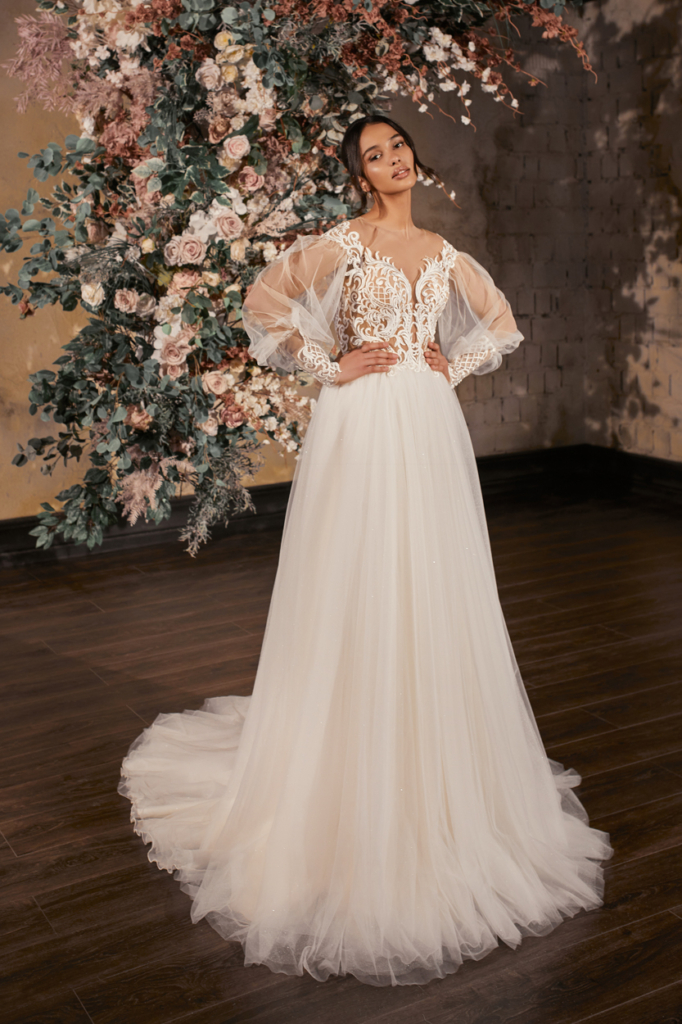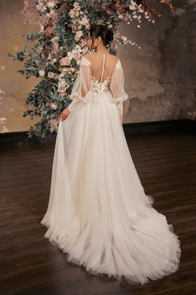 Rochie de mireasa tip linia A din tulle si corset transparent acoperit de dantela fina . Rochia se poate accesoriza cu maneci detasabile din tulle cu broderie .