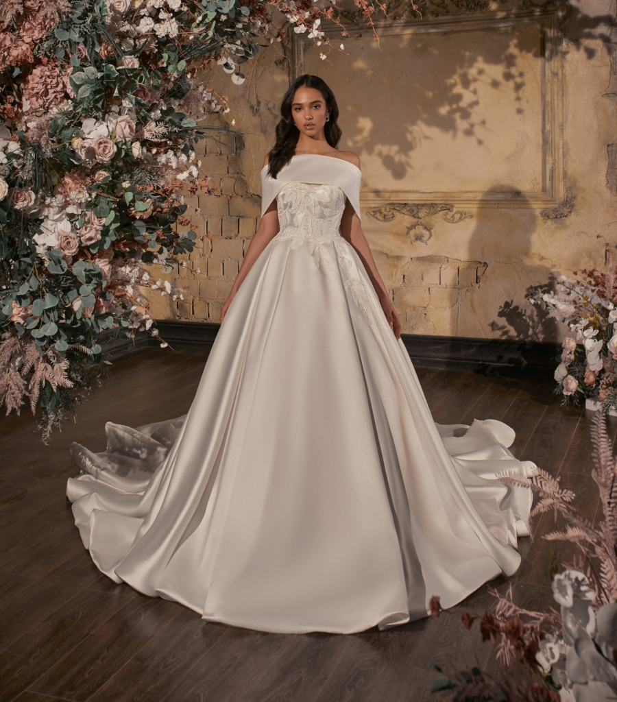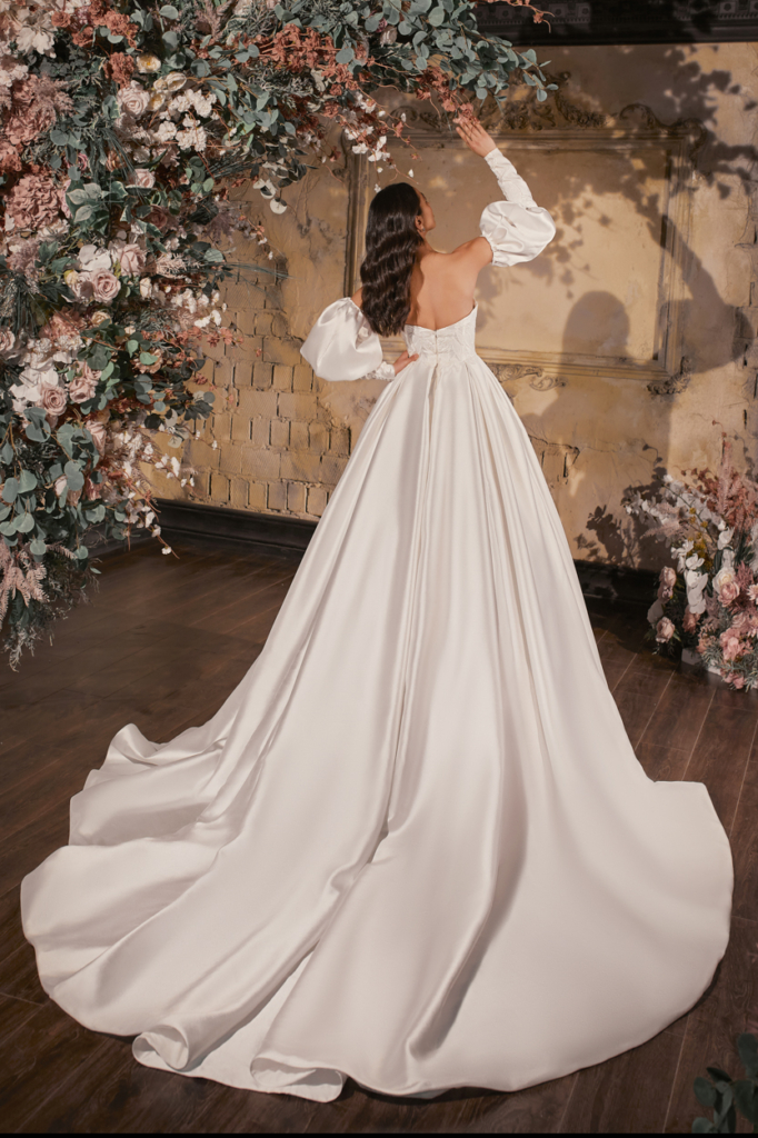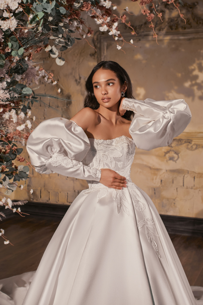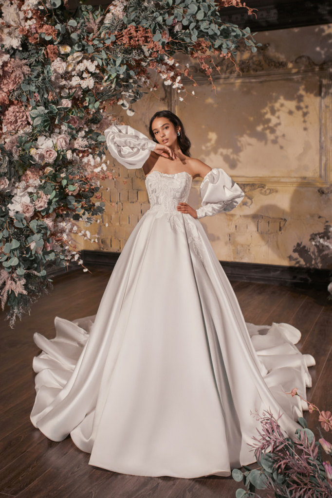 Rochie tip printesa din Mikado cu corset brodat si aplicatii florale ,manecile bufante detasabile dau un efect regal rochitei.