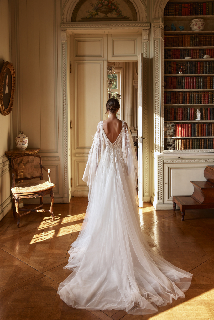 Rochie tip A line cu un corset semitransparent, decolteu in V in fata si spate, frumos brodat. Aripile si manusile decorate cu fulgi si cristale ofera eleganta tinutei.