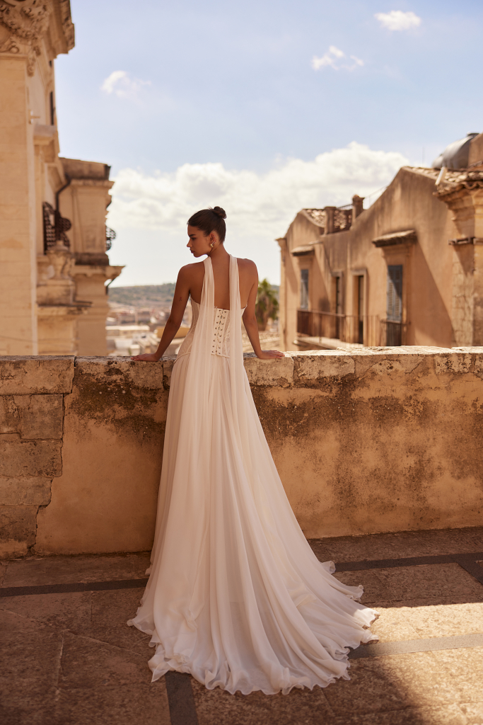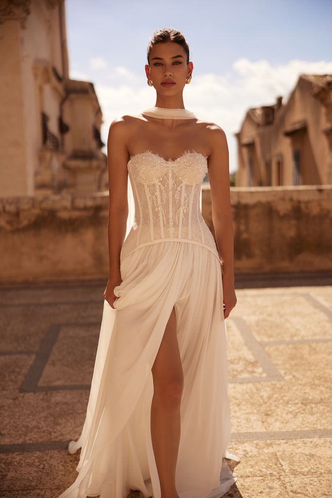 Un set format dintr-un corset semi-transparent și o fustă din chiffon. Corsetul este realizat din dantelă Chantilly, avand o broderie cusuta manual, mărgele și perle. Fusta are două split-uri și pliuri delicate în partea de sus.