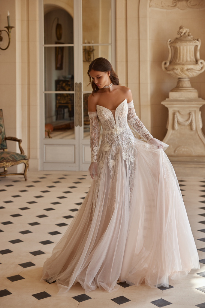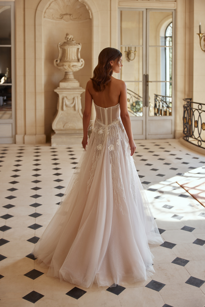 Rochie tip linie A, realizată dintr-o combinație de tulle, sclipici și dantela. Corsetul are un decolteu adânc în formă de V, decorat cu drapaj și broderii din cristale, mărgele și paiete. Fusta are inserții triunghiulare din dantela, cu o lejeritate mare . Mânecile sunt detasabile.
