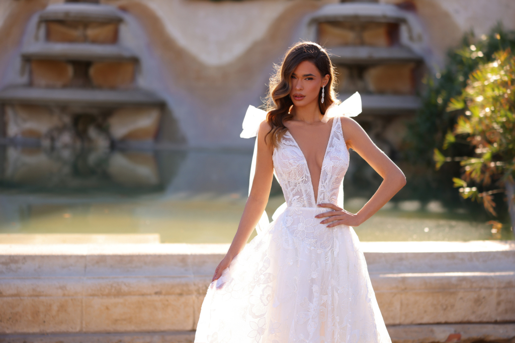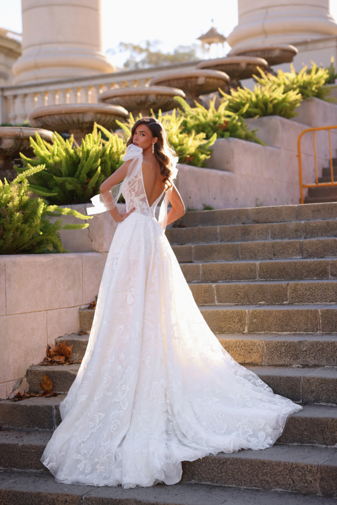 Rochia de mireasă A-line este o capodoperă elegantă și fermecătoare. Realizată dintr-o dantelă fină și brodată cu delicatețe, aceasta emană un aer romantic și sofisticat. Bustul decolteului adânc în formă de V este subliniat de bretele cu un accesoriu pe umeri, oferind o susținere perfectă. Spatele în formă de V adaugă o notă senzuală, evidențiind frumusețea siluetei. Fusta acestei rochii încântătoare are un design deosebit, iar o crăpătură subtilă pe picior adaugă o notă de seducție discretă. Pentru mireasa care vrea să fie fermecătoare și elegantă în ziua nunții, această rochie A-line cu detalii rafinate este alegerea ideală.