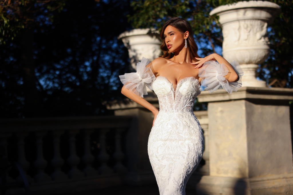 Rochia de mireasă sirena, realizată într-un stil elegant și sofisticat, impresionează prin detaliile sale delicate. Confecționată dintr-o dantelă brodată fină, aceasta emană feminitate și rafinament. Cu o croială ce urmărește linia corpului, rochia evidențiază formele și îi conferă miresei o apariție seducătoare. Pentru a completa într-un mod subtil această creație, se pot adăuga mâneci din tulle, care aduc un aer romantic și grațios. O astfel de rochie de mireasă îmbină perfecțiunea clasicului cu notele moderne și este potrivită pentru o mireasă ce își dorește o apariție unică și memorabilă.