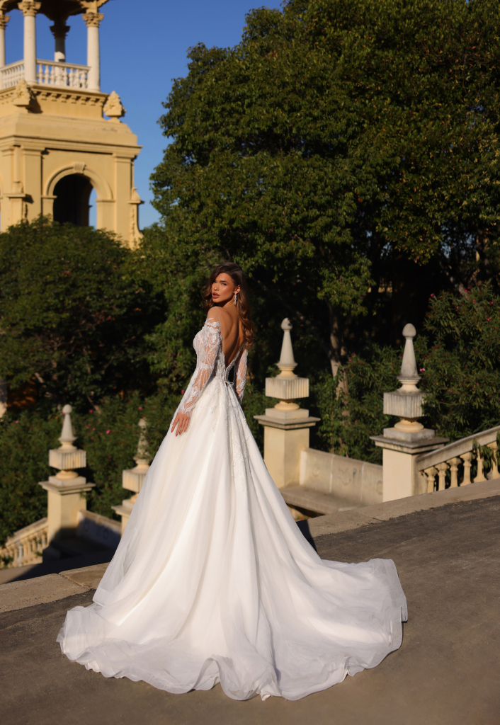 Rochia de mireasă A-line este un model care avantajează orice siluetă, având un ușor volum în partea de jos. Este o rochie elegantă, cu o croială precisă, realizată cu măiestrie. Este confecționată dintr-o dantelă brodată deosebită, adăugându-i un aer romantic și delicat. Decolteul în formă de inimă scoate în evidență frumusețea decolteului și a gâtului, iar spatele rochiei, cu un decolteu în V adânc, este închis cu un șnur subțire, oferind un plus de feminitate și subliniind silueta miresei.